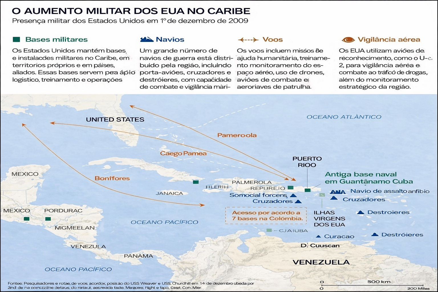 O mapa representa a presença e o fortalecimento militar dos Estados Unidos na região do Caribe no ano de 2009. Nele estão indicadas bases militares, rotas de voos, operações de vigilância aérea e a distribuição de navios de guerra no Mar do Caribe e áreas próximas.